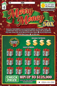 Merry Money 50X | IGT | Key Number Match | $5 | 1,800,000 | 1 in 4.59 | $125,000 |