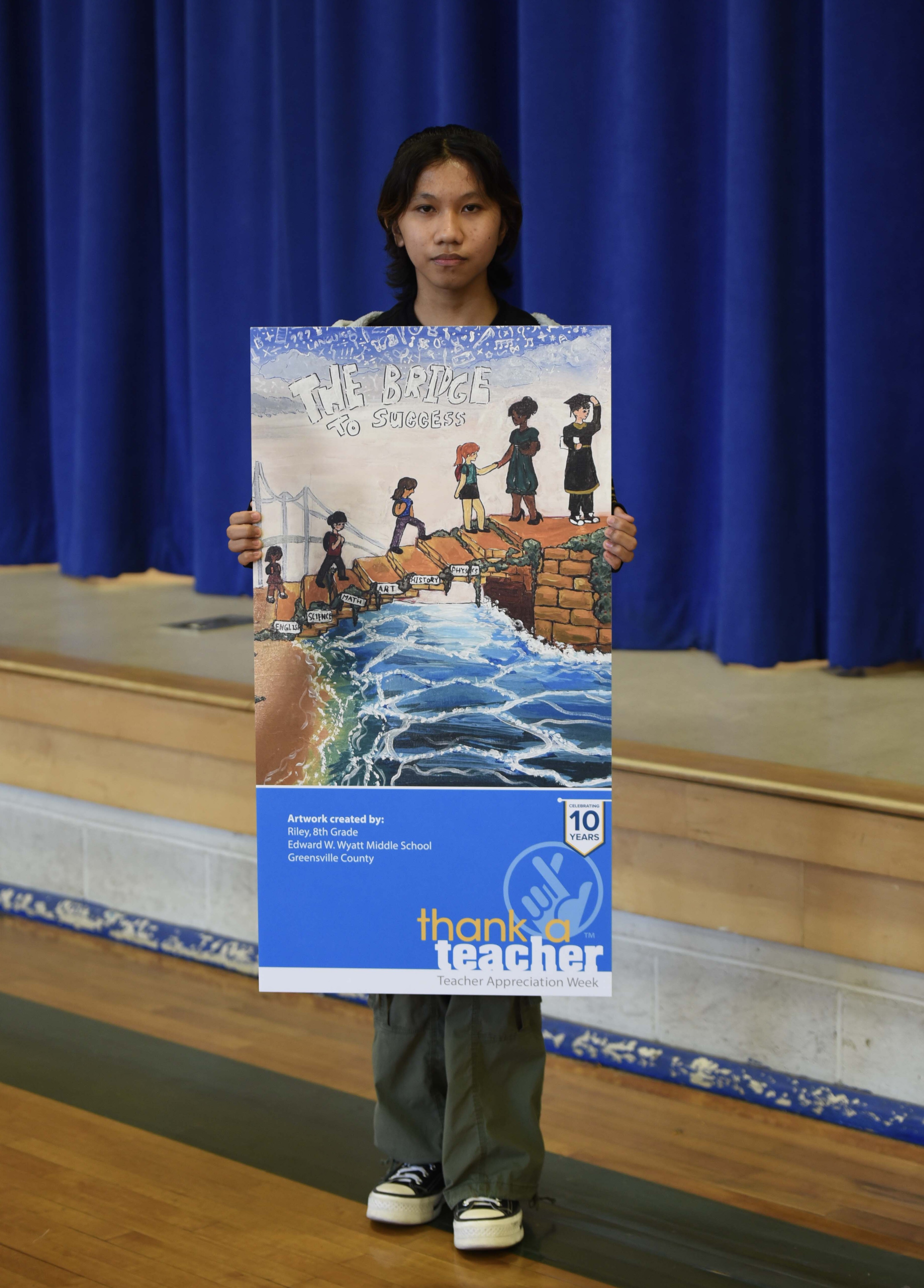 Last year, the Lottery surprised the three student winners: Avalyn Church, a 5th grader at Belle Heth Elementary School in Radford; Riley Rodriguez, an 8th grader at Edward Drew Middle School in Greensville County; and Allie Beatley, a 9th grader at Grafton High School in York County. Their artwork was shared on more than 200,000 digital and printed thank-you notes as part of the record-breaking 2025 Thank a Teacher campaign.
